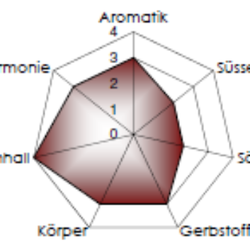 Farbe: Sehr dichtes Rubinrot mit tiefem, schwarzem Kern, markante Violettreflexe. Aromatik: Typische Aromatik, schwarzbeerig (Cassis), kompottartig, köstliche Fruchtsüsse, feinduftige Würze nach Gewürznelken und Zimt, subtil vegetale Note (Peperoni, Efeu). Körper: Im Gaumen füllig mit einer verführerischen Alkoholsüsse, betörende Gaumenaromatik, geschliffene, gute Gerbstoffe, zurückhaltende Säure. Qualität: Dichter, tiefer Wein, enorm aromatisch und rustikal.